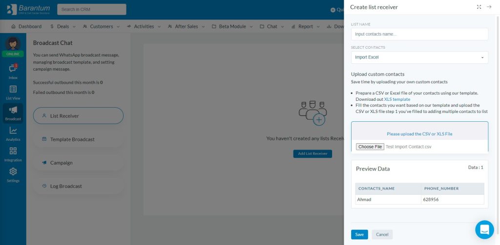 Impor daftar kontak pelanggan ke sistem Barantum. Anda bisa mengelompokkan penerima berdasarkan segmen; misalnya pelanggan baru, pelanggan aktif, atau pelanggan yang belum melakukan pembelian ulang.