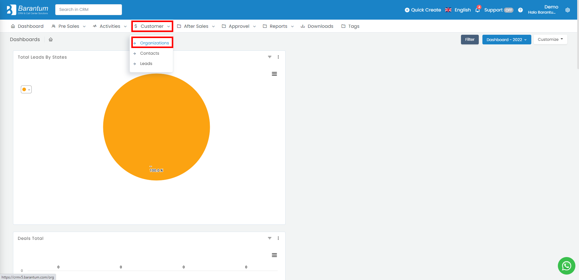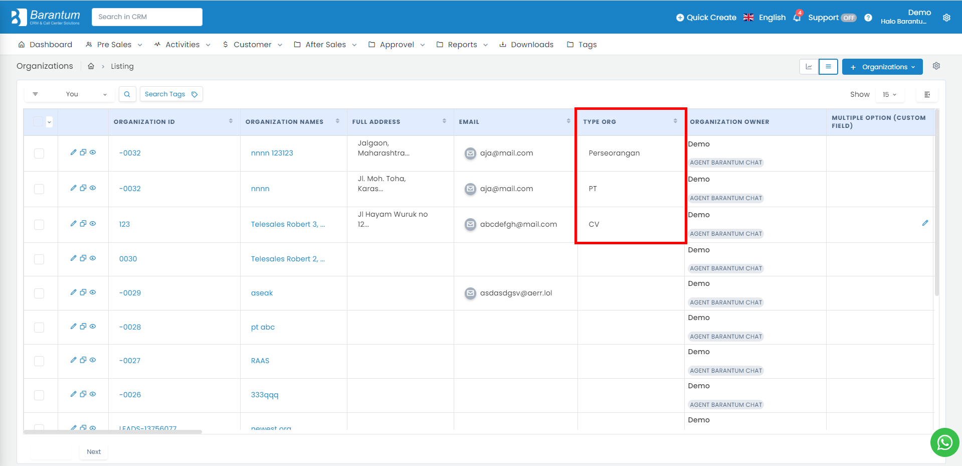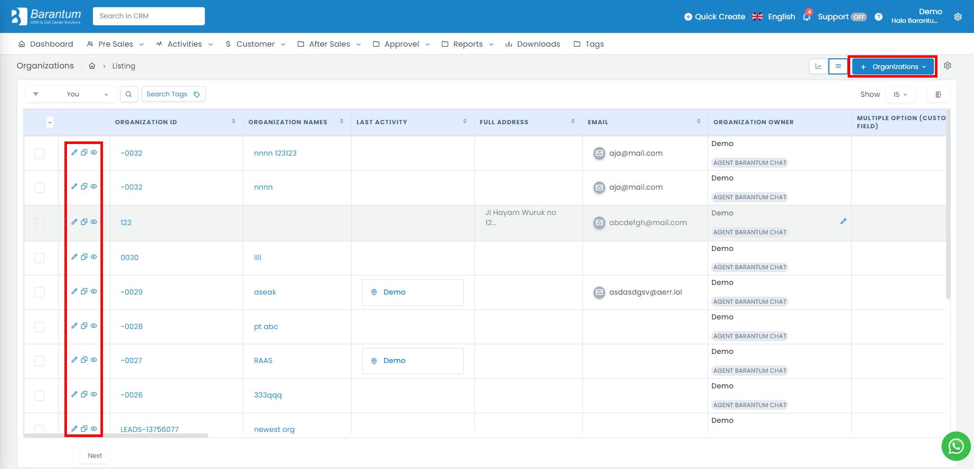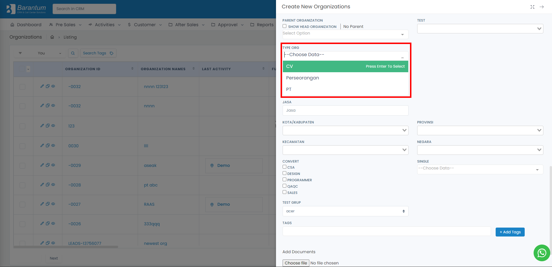 1. Buka Barantum CRM, lalu masuk ke Listing Organizations dengan cara klik Customer > Organizations