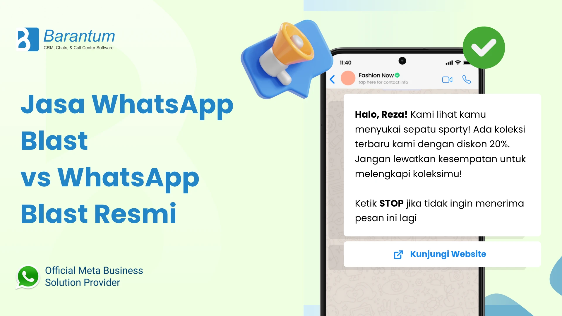 WhatsApp Blast resmi: menggunakan WhatsApp Business API yang legal dan diakui Meta. Biasanya disediakan melalui mitra resmi seperti Barantum, yang memastikan semua pesan dikirim secara aman, terverifikasi, dan sesuai aturan platform.