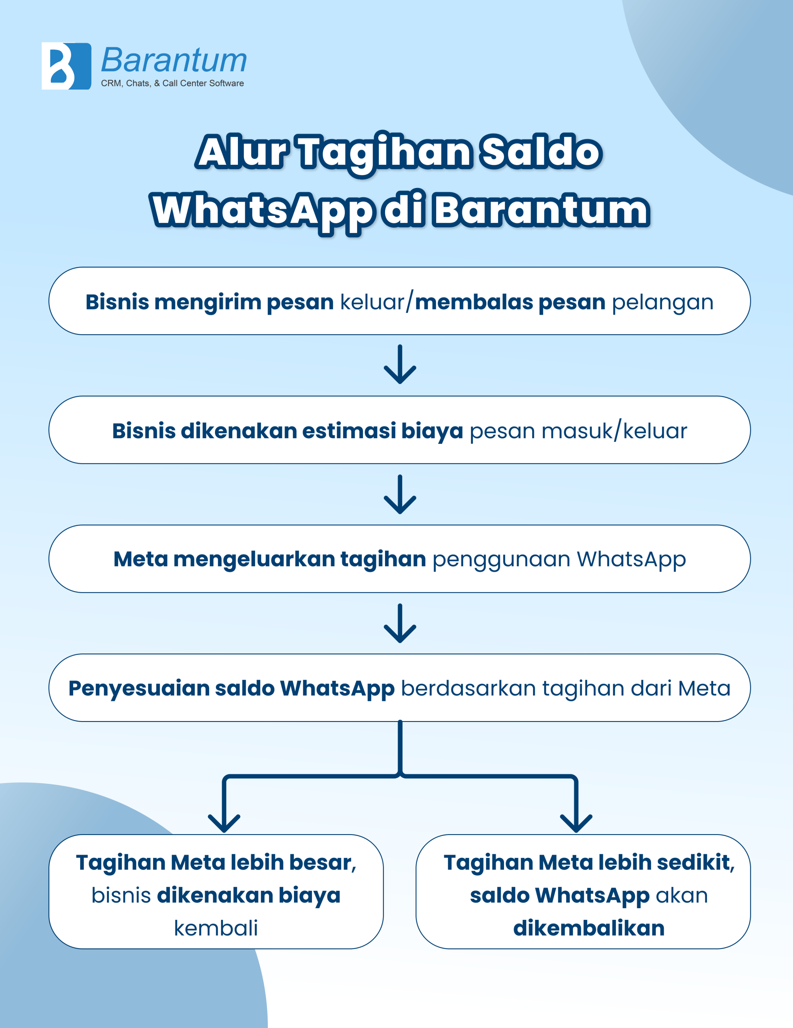 Sehingga jika tagihan WhatsApp dari Meta sudah dikeluarkan, maka Anda akan dikenakan biaya kembali jika saldo yang dikeluarkan masih kurang dibanding dengan tagihan Meta. Namun, saldo Anda akan dikembalikan (refund) jika biaya yang dikeluarkan lebih banyak dibandingkan tagihan dari Meta.
